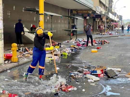 One of the clean-up operations that were initiated by communities post looting. This is in the coastal city Durban in KwaZulu-Natal province (Zambian Whistleblower via Facebook)